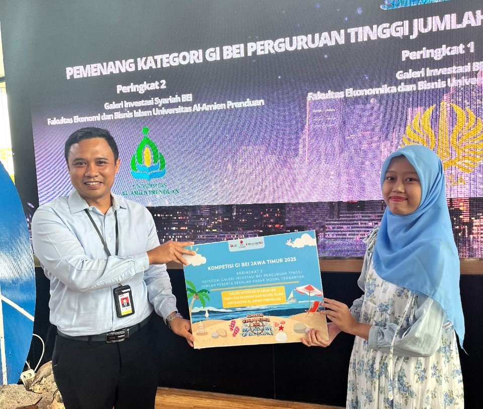 Surabaya, 06 November 2025 – Galeri Investasi Syariah (GIS) Bursa Efek Indonesia Universitas Al Amien Prenduan kembali menorehkan prestasi membanggakan di tingkat Provinsi. Pada ajang Kompetisi GI BEI 2025 “Ride the Wave of Exellence”, GIS FEBI Universitas Al Amien Prenduan berhasil meraih Peringkat 2 dalam Kategori Perguruan Tinggi dengan Jumlah Peserta Sekolah Pasar Modal (SPM) Terbanyak.