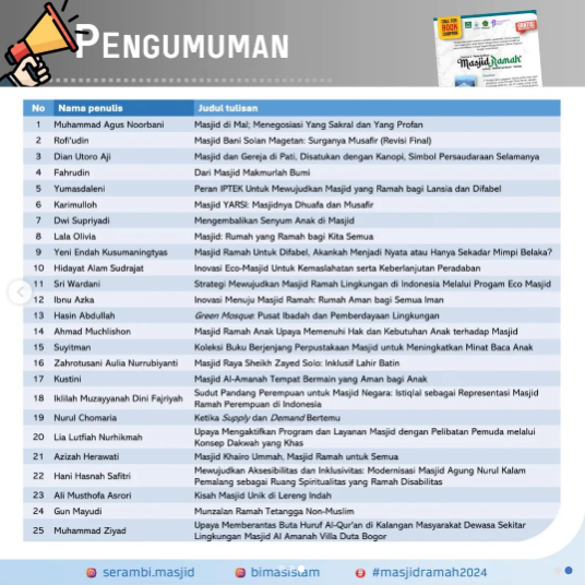 Esai dengan judul "Masjid: Rumah yang Ramah bagi Kita Semua" yang ditulis Lala Olivia berhasil menarik perhatian juri dan menduduki peringkat tertinggi. Esainya berhasil menonjol di antara 158 naskah peserta yang beragam, membuktikan kegemilangan gagasannya tentang pentingnya membangun masjid yang ramah dan inklusif.